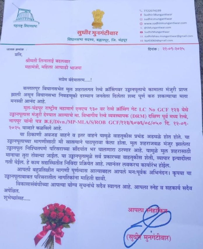 आमदार श्री. सुधीर मुनगंटीवार यांच्या सातत्यपूर्ण पाठपुराव्याला यश मिळाले असून मुल शहरालगत रेल्वे क्रॉसिंगवर उड्डाणपुलाच्या बांधकामास अखेर मंजुरी मिळाली आहे. विभागीय रेल्वे व्यवस्थापक (डीआरएम) दीपक कुमार गुप्ता यांनी याबाबत अधिकृत पत्राद्वारे आमदार श्री.मुनगंटीवार यांना मंजुरीची माहिती दिली आहे.मुल–चंद्रपूर राष्ट्रीय महामार्ग एनएच ९३० वरील रेल्वे क्रॉसिंग गेट क्र. GCF १२३ येथे उड्डाणपुलाच्या मंजुरीबाबत डीआरएम दक्षिण पूर्व मध्य रेल्वे नागपूर यांनी पत्राद्वारे अधिकृत कळविले आहे.