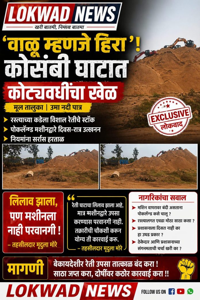 рдореВрд▓ рдкреНрд░рддрд┐рдирд┐рдзреА ;┬а рдореВрд▓ рддрд╛рд▓реБрдХреНрдпрд╛рддреАрд▓ рдХреЛрд╕рдВрдмреА рдпреЗрдереАрд▓ рдЙрдорд╛ рдирджреА рдкрд╛рддреНрд░ рд╕рдзреНрдпрд╛ тАШрд╡рд╛рд│реВрдЪрд╛ рд╕реЛрдиреНрдпрд╛рдЪрд╛ рдЦрдЬрд┐рдирд╛тАЩ рдард░рдд рдЕрд╕реВрди, рдореЛрдареНрдпрд╛ рдкреНрд░рдорд╛рдгрд╛рдд рд░реЗрддреАрдЪрд╛ рдЙрдкрд╕рд╛ рд╕реБрд░реВ рдЕрд╕рд▓реНрдпрд╛рдЪреА рдзрдХреНрдХрд╛рджрд╛рдпрдХ рдорд╛рд╣рд┐рддреА рд╕рдореЛрд░ рдЖрд▓реА рдЖрд╣реЗ. рдкреЛрдХрд▓реЕрдиреНрдбрд╕рд╛рд░рдЦреНрдпрд╛ рднрд╛рд░реА рдпрдВрддреНрд░рд╛рдВрдЪреНрдпрд╛ рд╕рд╣рд╛рдпреНрдпрд╛рдиреЗ рд╣рд╛ рдЙрдкрд╕рд╛ рд╕реБрд░реВ рдЕрд╕рд▓реНрдпрд╛рдиреЗ рдирд┐рдпрдорд╛рдВрдЪреЗ рдЙрдШрдб рдЙрд▓реНрд▓рдВрдШрди рд╣реЛрдд рдЕрд╕рд▓реНрдпрд╛рдЪрд╛ рдЖрд░реЛрдк рд╕реНрдерд╛рдирд┐рдХ рдирд╛рдЧрд░рд┐рдХрд╛рдВрдХрдбреВрди рдХрд░рдгреНрдпрд╛рдд рдпреЗрдд рдЖрд╣реЗ.